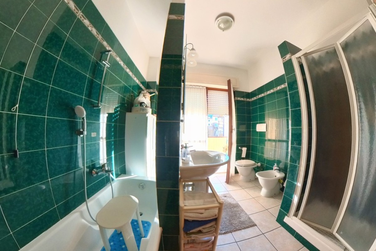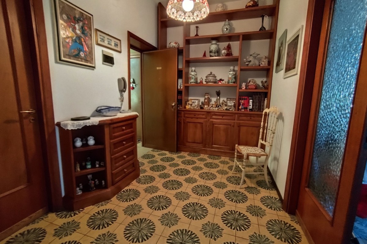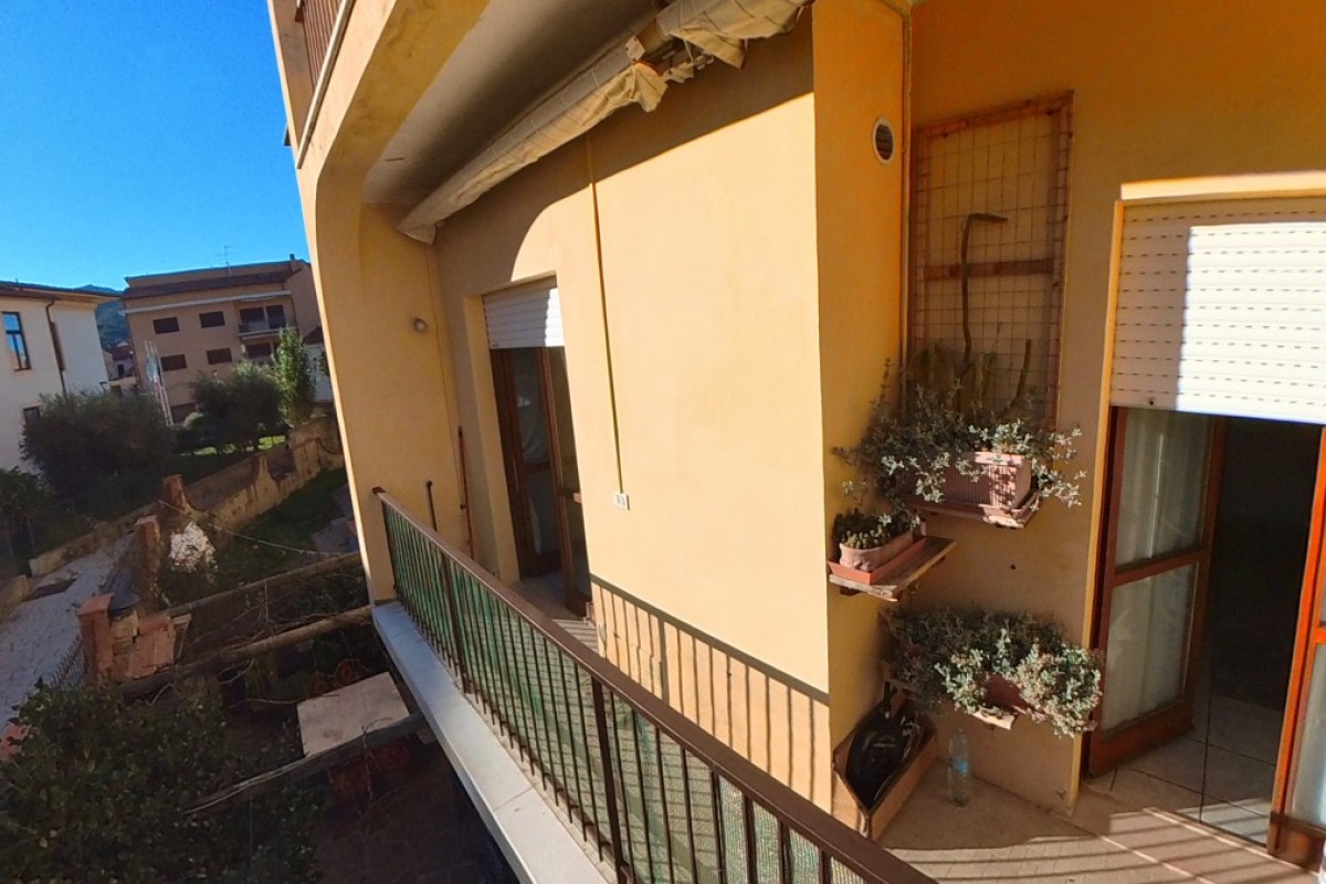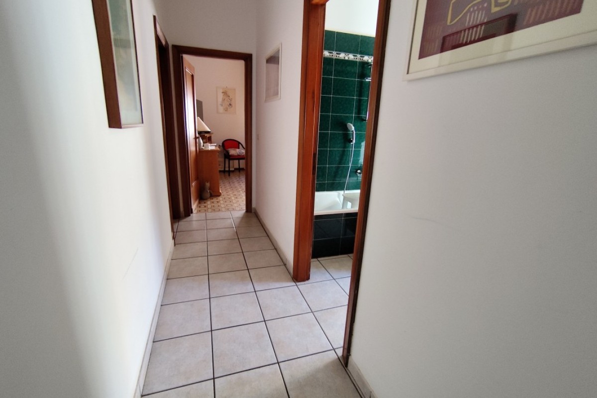 Buona esposizione e dotato di ascensore l'appartamento posto al piano primo si suddivide in ampio ingresso, enorme soggiorno collegato come le camere alla terrazza, lungo corridoio disimpegno per la cucina, i due bagni e le due camere. cucina e bagni hanno il proprio balcone. posto auto privato.